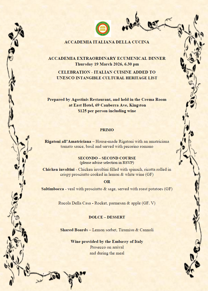 You are invited to our Accademia dinner celebrating the UNESCO cultural heritage listing for Italian cuisine. At this special event, His Excellency Nicola Lener and his wife will be in attendance to celebrate this important occasion.