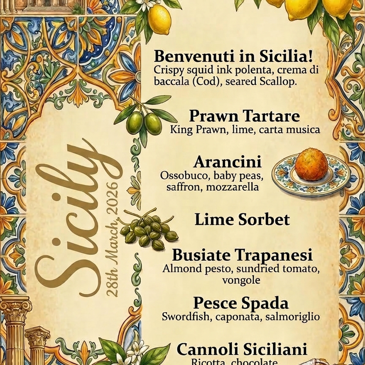 Its dishes are known for their bright, aromatic flavours, rustic elegance, and the perfect balance of simplicity and sophistication. Join us for a 5-course Sicilian tasting menu that brings the island’s essence to your table